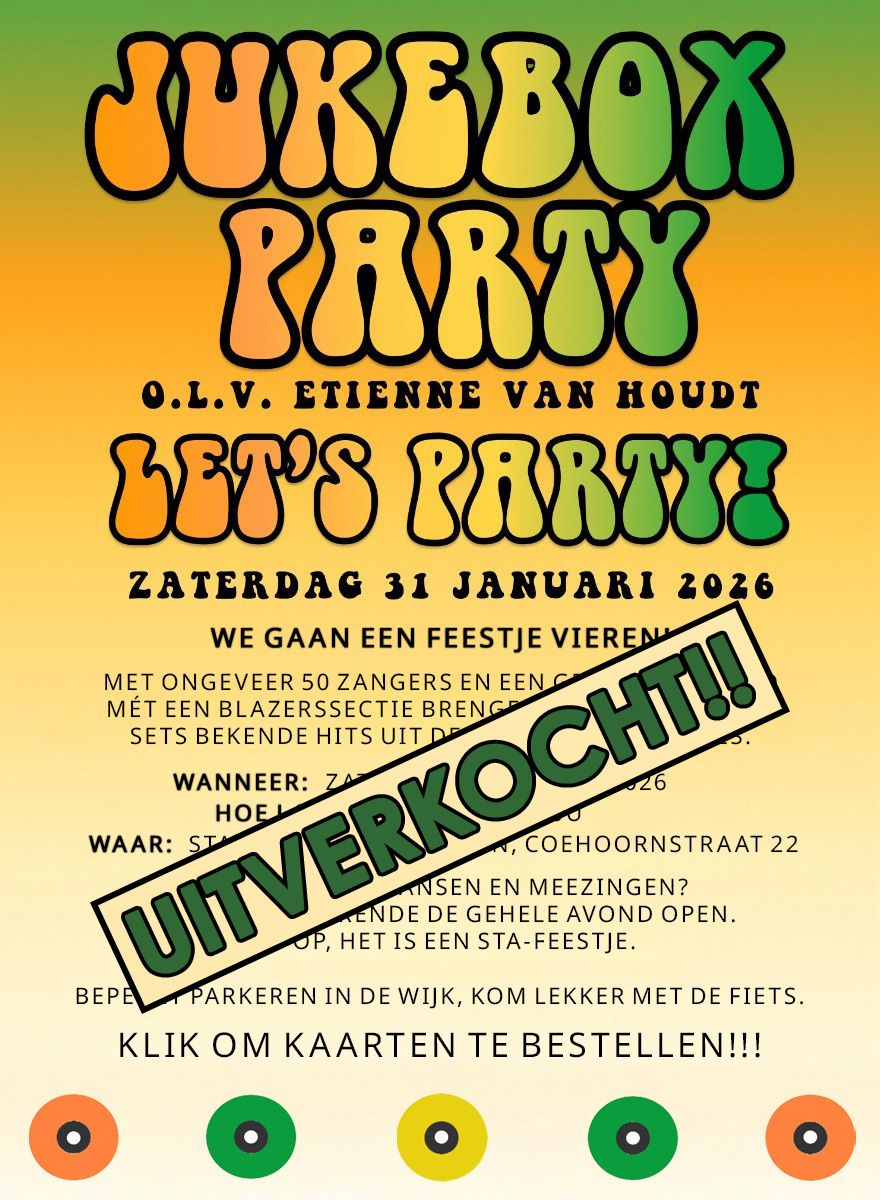 Jukebox Party is een grote zanggroep in Nijmegen die swingende muziek uit de sixties en seventies zingt. De muziek van Jukebox Party bestaat dan ook uit zeer herkenbaar jukebox repertoire. Dit doen we door wekelijks op de dinsdagavond met elkaar te repeteren in de Boog in Lent. Wij verzorgen hoofdzakelijk optredens met liveband met blazers, Yeahh!